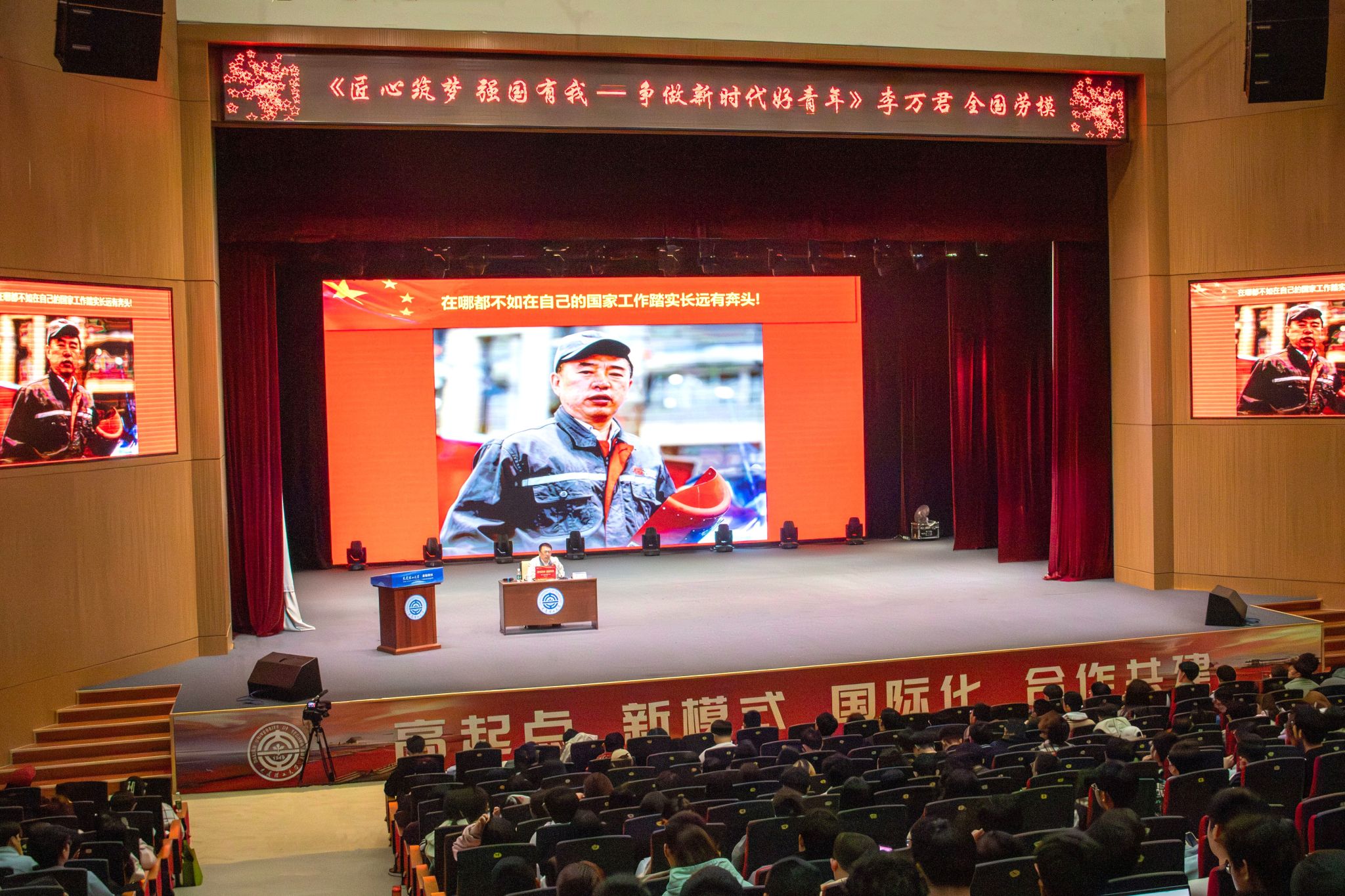李万君在讲座中结合个人的成长经历,从“树立理想,争做工匠”“无私奉献,培育工匠”“敢于担当,勇于创新”“忠诚企业,报效国家”和“用匠心实现中国梦、高铁梦、个人梦”五个方面讲述了自己从一名普通电焊工成长为一名高铁焊接大师、大国工匠的心路历程,讲述了改革开放40多年来,中国高铁事业从无到有、从制造到创造、从追赶到领跑的光辉历程,让到场师生感受到国家从站起来、富起来到强起来的伟大飞跃。他用几十年的实际行动诠释了“工匠精神”深刻内涵,并勉励现场同学们:“只要我们用工匠精神把每天的工作干好、干精,都会走出精彩的人生。”