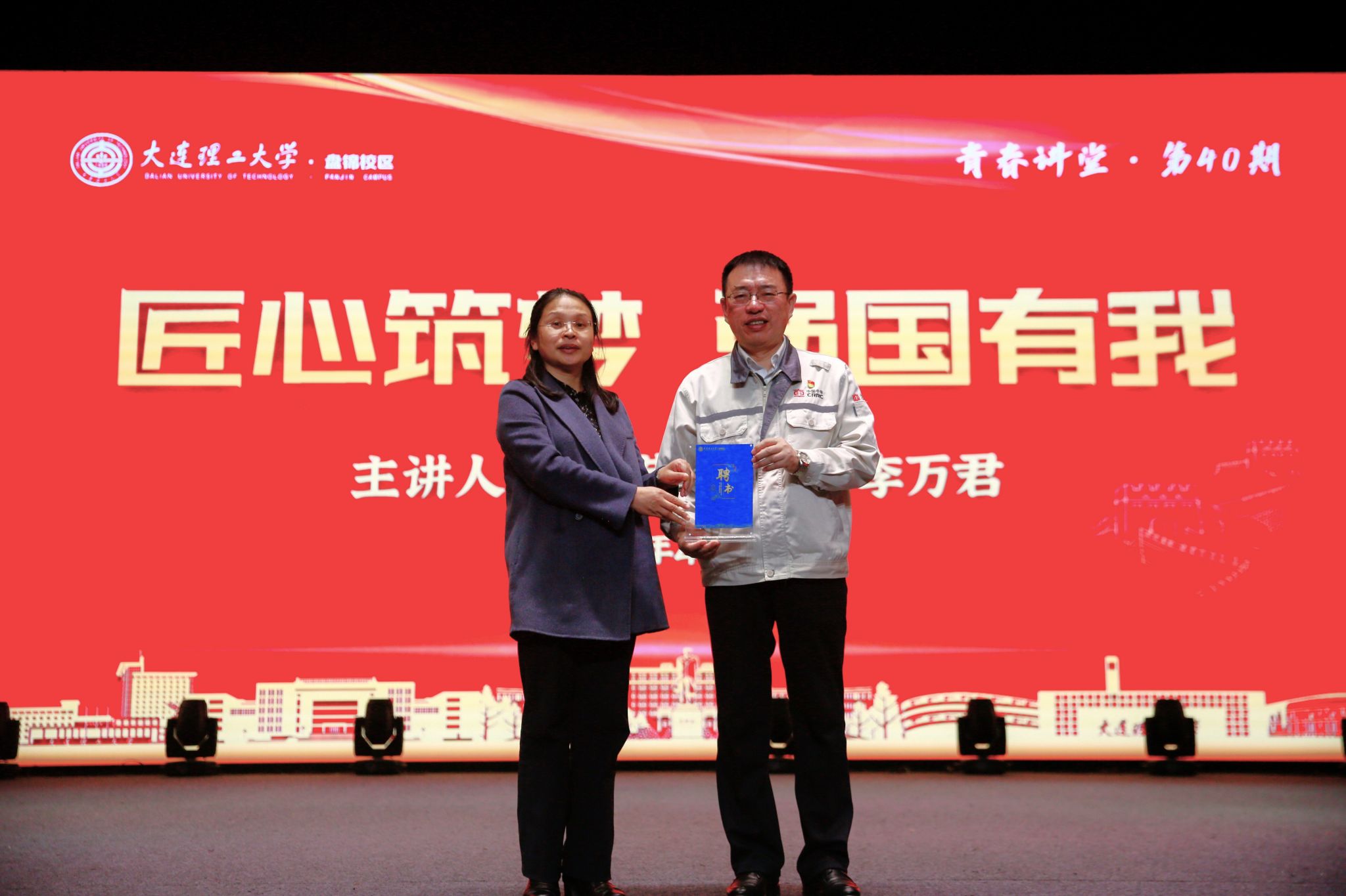 讲座最后,校区党工委副书记兼管委会副主任杨晓英为李万君颁发大连理工大学盘锦校区校外成长导师聘书。活动结束后,李万君走到观众席与现场师生合影留念。