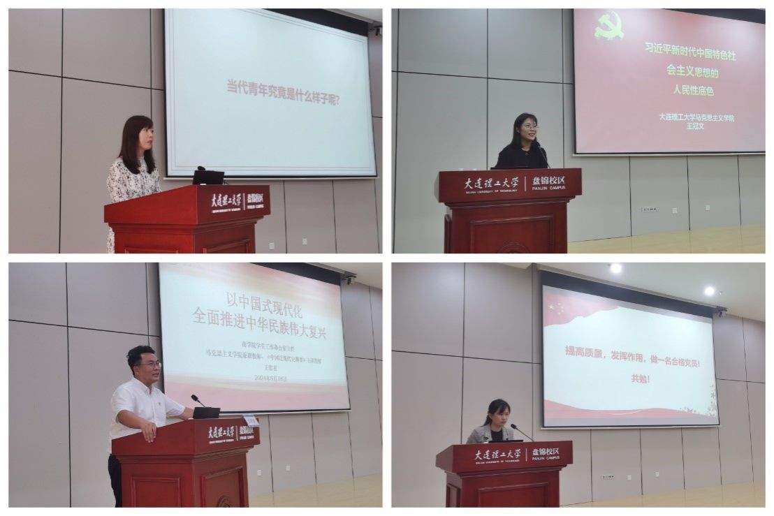 本次培训采用理论学习、专题报告、红色观影相结合的方式进行。马克思主义学院副教授、习近平新时代中国特色社会主义思想概论教研室副主任王冠文以《习近平新时代中国特色社会主义思想的人民性底色》为题作报告,以脱贫攻坚和生态治理为切入点,结合大量实例对习近平新时代中国特色社会主义思想的人民性底色进行了深入解读;学校后勤党委组织员、党校兼职教师张平媛作专题报告《中国梦属于青年一代》,讲述了我校优秀师生校友秉承服务国家重大需求,成就“国之重器”和“大国工程”的故事;商学院学生工作办公室主任、马克思主义学院兼职教师王常有作专题报告《以中国式现代化全面推进中华民族伟大复兴》,鼓励青年学子坚定理想信念、担当时代责任,争做推进中国式现代化的先锋力量;盘锦校区党工委组织员孙晋对入党流程进行细致介绍,鼓励学员们以实际行动不断向党组织靠拢。