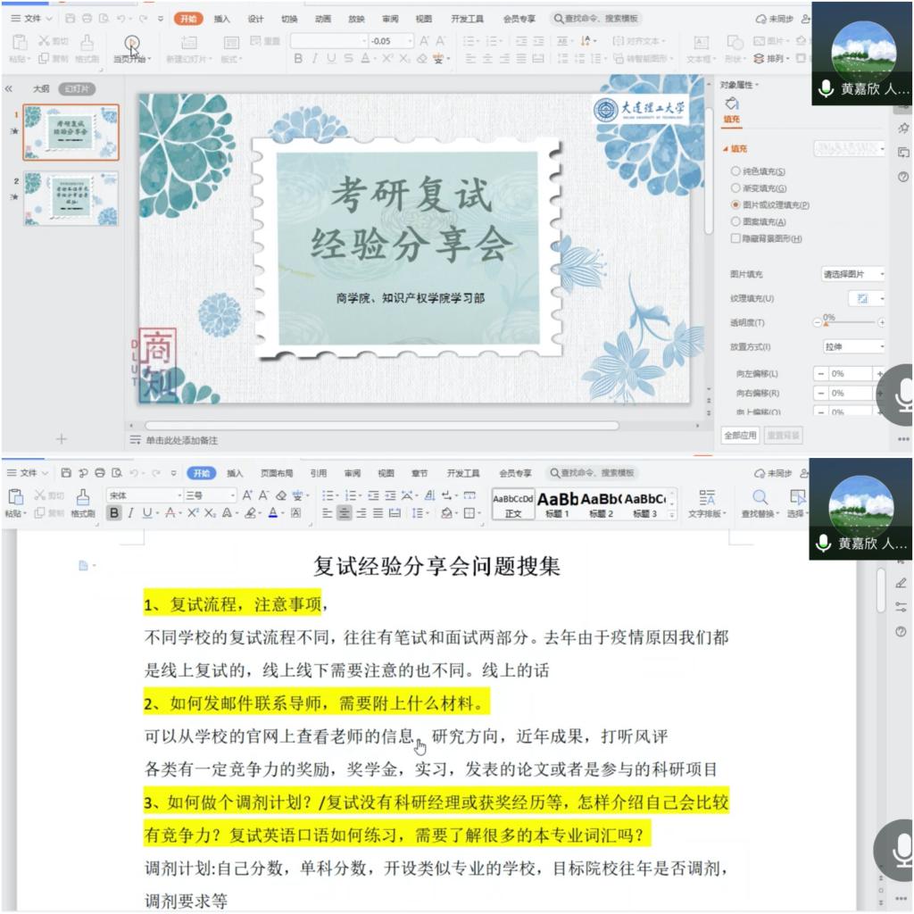 为助力学院2017级学生备战考研复试,解决同学们关于考研复试的困惑,3月9日晚商学院、知识产权学院学生会邀请五位2016级考研成功学生举办线上考研复试经验分享会。
