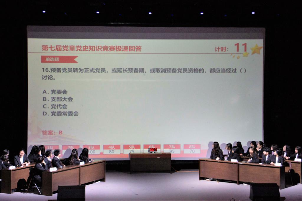经过初赛激烈角逐,共有24名同学晋级学院复赛,3人一组共8支队伍在复赛现场进行了火热比拼。复赛分为“积分筑垒”“极速回答”“你选我答”以及“险中求胜”四个环节。在比赛各个环节,选手们从容不迫,回答问题迅速准确,各组分数你追我赶,交替攀升,比赛现场气氛热烈。参赛选手们的精彩表现充分展现了扎实的党章党史知识积累和奋发昂扬的精神面貌。