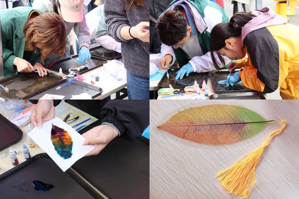 一脉相承精神永传。“一脉相承”活动是利用树叶叶片制作书签,将经过特殊处理的树叶刷去叶肉,用染料对叶脉进行染色二次创作,将其塑封制作成叶脉书签,在运用了植物学知识的同时,锻炼了同学们的动手能力,让同学们发现生活中处处有知识,处处有美好。在志愿者的引导下,同学们共享工具和颜料,合作互助,顺利制作出大胆新颖,异彩纷呈的叶脉书签作品,吸引了不少同学前来观摩。