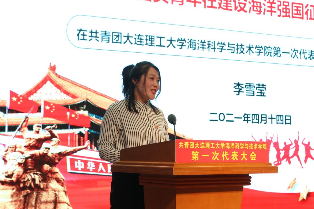 会上,海洋学院辅导员、团学指导教师李雪莹受共青团大连理工大学海洋科学与技术学院委员会委托代表学院团委做题为《牢记使命,求实创新,团结带领全院团员青年在建设海洋强国征程中贡献青春力量》的工作报告。从强基固本提质量,多维度强化团员青年的理想信念;建章立制强规范,多渠道加强学院团委的组织建设;精益求精树品牌,多层次打造海洋学院的文化特色;学思践悟谱华章,精心构筑创新实践体系四个方面汇报梳理了海洋学院2018年至2020年的团委各项工作。随后,李雪莹总结了新时期学院共青团肩负的责任与使命,并对学院共青团工作做以展望,海洋学院团委将从坚持 “一个核心”,深入贯彻落实社会主义核心价值观的导向性作用;构筑“五位一体”教育体系,系统践行立德树人根本使命;科学把握工作规律,搭建高质量育人平台三个方面开展各项工作。