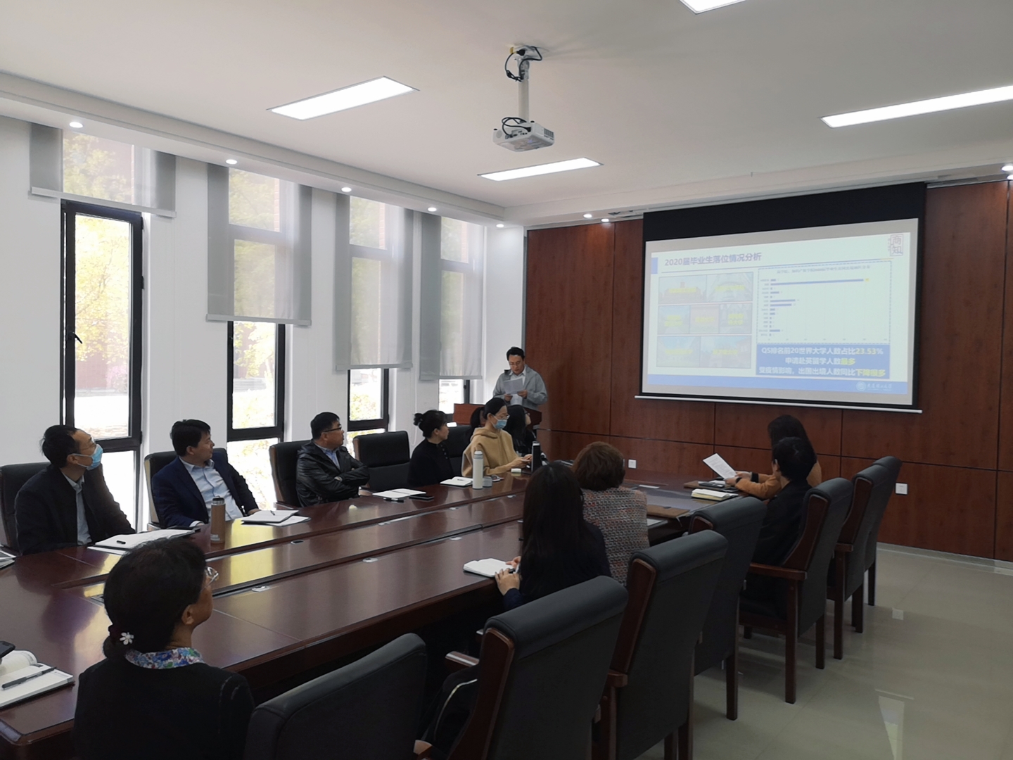 梳理当前落位情况,把握就业指导方向。首先,学院学生工作办公室主任王常有老师对2020届毕业生落位情况进行详细介绍,并分析了以往就业指导工作的经验和不足。然后,王常有老师介绍了目前针对学院2021届毕业生开展的就业指导举措,并汇报了2021届毕业生当前实时落位情况。最后,王常有老师认真分析了学院2021届毕业生就业指导工作目前存在的困难以及未来工作思路,并简要介绍了学院承担的2021年招生工作。