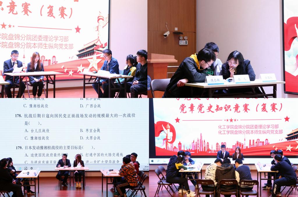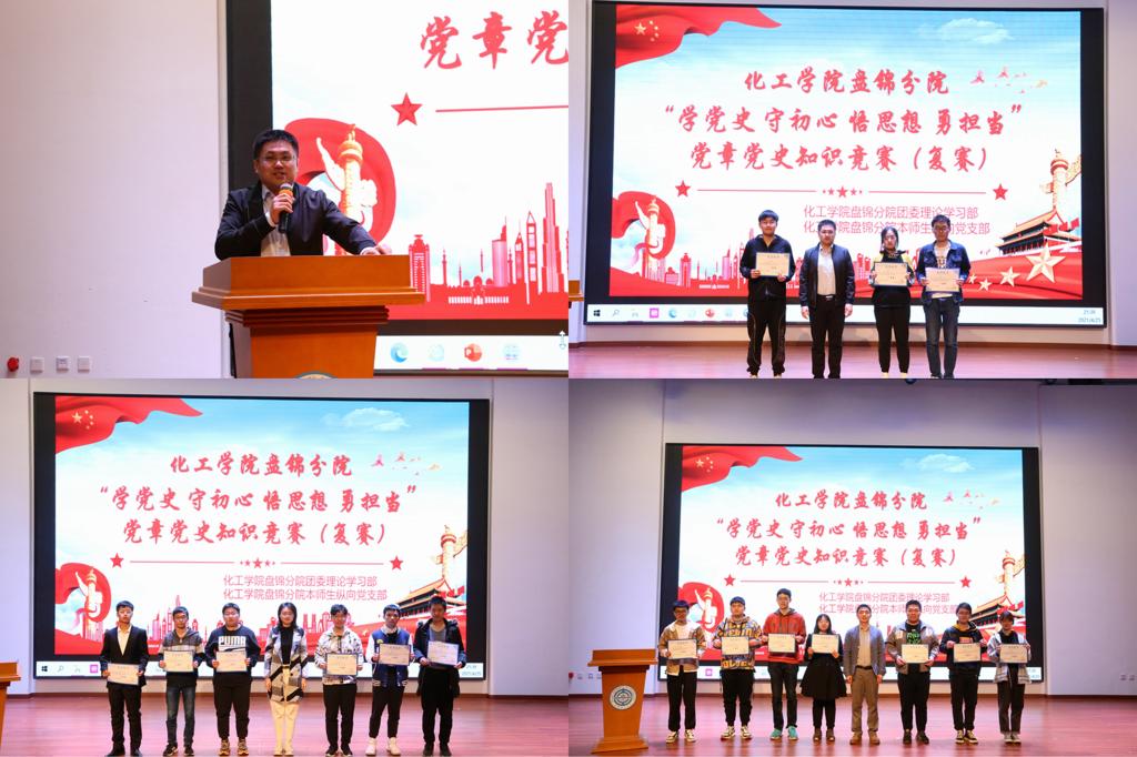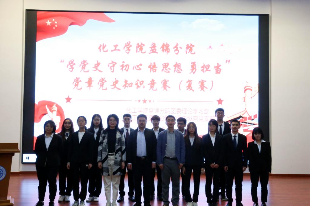 今年是中国共产党成立100周年,为不断深化“不忘初心、牢记使命”主题教育成果,创新党史学习的方法和途径,近日,化工学院盘锦分院本师生纵向党支部与化工学院盘锦分院团委在E03报告厅举办了以“学党史,守初心,悟思想,勇担当”为主题的党章党史知识竞赛复赛。化工学院盘锦分院学生工作办公室主任黄维,分院辅导员陈玉阳、刘坤出席比赛并担任评委。