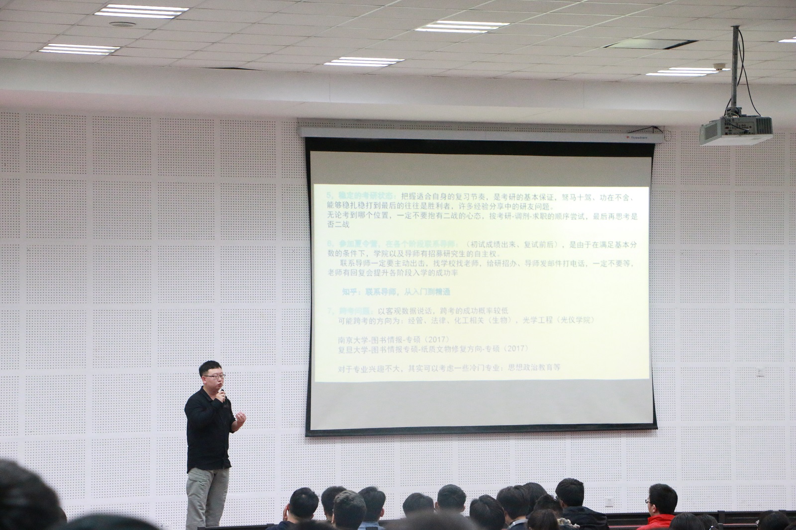 黄维老师按照了解自己、了解选择、作出决定的思考顺序展开指导,他表示,从“你的未来职业是否对学历、技术有硬性要求”,“你是否为了延迟就业时间而选择继续深造”等几个关键问题思考出发,详细分析了求职就业、考研、出国等不同方向的优势与劣势。鼓励同学们根据自身实际情况确定未来发展方向,不断学习进取,努力达到满意的、适合的毕业去向。
