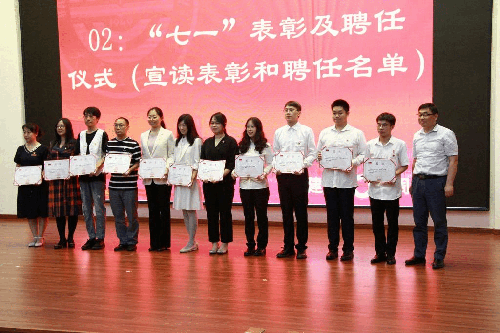 大会在雄壮的国歌声中拉开帷幕。商学院、知识产权学院副院长洪勇宣读了“两优一先” 表彰名单,“奋斗百年路,启航新征程”主题征文活动获奖名单及团建指导员、党建导师聘任名单,并为他们颁发了荣誉证书和聘书。