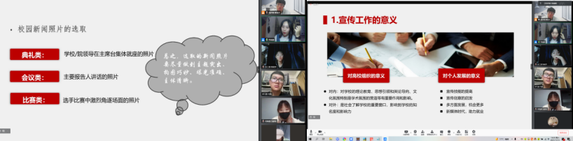 把关宣传窗口,打造优质平台。校区团工委副书记陈嘉颖结合以自身发展为例,点明了宣传工作的主要内容及形式,为学生干部们介绍了不同情境下的新闻推送与新闻制作要点以及其他宣传相关的注意事项,通过分类讲解让学生干部们对于学院宣传工作有了更为深刻的认识。