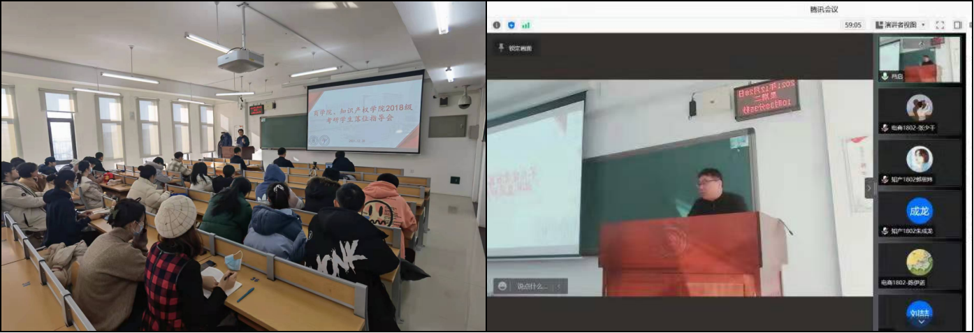 为进一步帮助学院2018级考研学生明确落位目标,做好寒假规划,高效合理度过后考研时期,商学院、知识产权学院于12月28日在A01-S305教室举办考研学生落位指导会。商学院、知识产权学院副院长李彤,党总支副书记、副院长赵博以及毕业年级辅导员王常有、肖启共同帮助考研同学做好后续发展规划,明确落位目标,学院140名2018级考研同学通过线上线下方式参会。