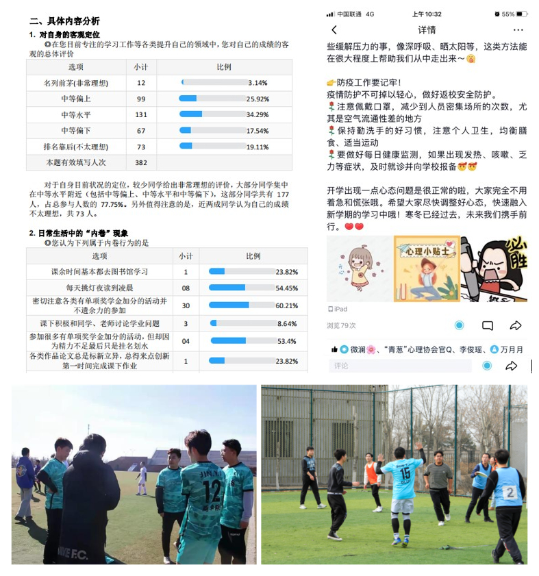 身心健康促进课。为进一步增强商知学子心理素质,学院“青葱”心协结合青年学生特点,针对当下热点话题“内卷”进行广泛调研,详细了解学院学生观点看法;编写发布“心理小贴士”系列说说,营造积极向上氛围;召开学院学生返校座谈会,及时了解学生返校后思想动态。为进一步浓郁学院体育锻炼氛围,丰富学生课余文化生活,学院相继举办“迎风杯”飞盘大赛、足球羽毛球友谊赛,帮助同学们舒缓学习压力,培养团结协作精神。