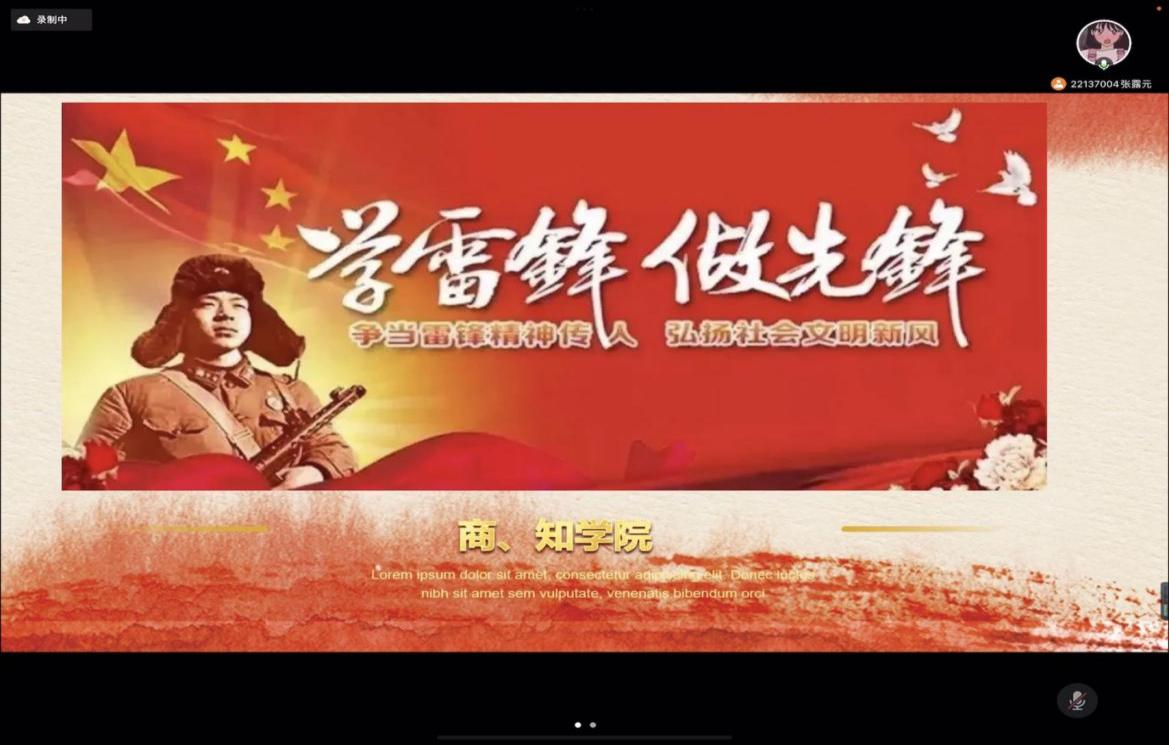 阳春三月,鸟语花香,在全国第60个学雷锋纪念日到来之际,为深入贯彻落实习近平总书记关于学习雷锋的重要指示批示精神,教育引导广大青年学生弘扬雷锋精神、传承志愿风尚、厚植爱国爱校情怀,商知研究生班以“学习雷锋精神”为主题,召开了线上“学雷锋”主题班会。班长张露元同志首先向学院全体研究生说明目前的疫情防控形势,鼓励大家坚定信心,团结互助,严格遵守疫情防控政策。然后,张露元同志向大家讲述了雷锋故事,解读了雷锋精神,鼓励同学们在学习、工作、生活中做一颗“永不生锈的螺丝钉”。本次会议营造了人人争当雷锋的良好氛围,引导同学们以不负时代、勇毅前行的奋进姿态开启2022年春季学期新征程。