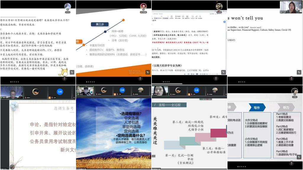 4月17日,学院举办留学经验分享会,邀请张煊阳、于丹凤、张逢露、马卉洁和卢宛彤五位同学结合自身留学申请经历,从前期择校方法、信息搜集,中期材料准备、注意事项,后期生活费用、沟通技巧以及全程时间安排等方面进行介绍和分享。同日,举办公考经验分享会,陈哲明、周昊天两位同学简要分析当前选调趋势,并根据自身经历指出备考时需要重点关注的复习内容,张阳阳同学介绍国考的具体流程,并对报名和备考两方面做重点介绍,同时分享国考各类题型的答题技巧,强调备考心态的重要性。
