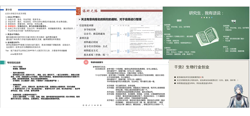 会上,潘晓青校友和任浩雯同学对保研各个环节进行了详细介绍,重点介绍了保研过程中的关键环节如资料收集、各个高校夏令营主要考核内容、自我介绍内容要凸显个人优势、面试时需放平心态等;在考研方面,潘彦容校友和李国防同学对国内外院校选择、资料收集、备考期间的准备和状态给出了细致的建议;在就业方面,熊柯旭校友分享了自己在华大基因研究院读博士的经历,也给同学们提出了灵活就业、选择适合自己的工作的建议。周梦迪校友以自身本科—研究生—就业经历为线分享了从本科学习直到就业的经验,向同学展示了一条较为清晰的发展路线,为同学们点明了方向。