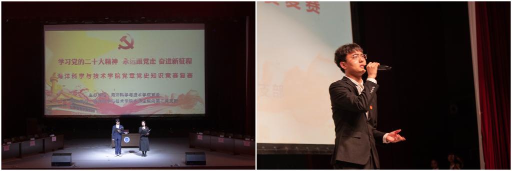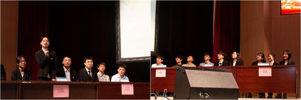 竞赛开始前,两名学子饱含深情地诵读诗歌《青春中国》,深深地激发了同学们的爱党爱国情怀。晋级复赛的18名同学自由组成的6支队伍依次登场,他们分别是“星火”队、“海洋青年先锋”队、“红映山河”队、“初心始发”队、“书生意气挥斥方遒”队、“‘四有’青年”队。
