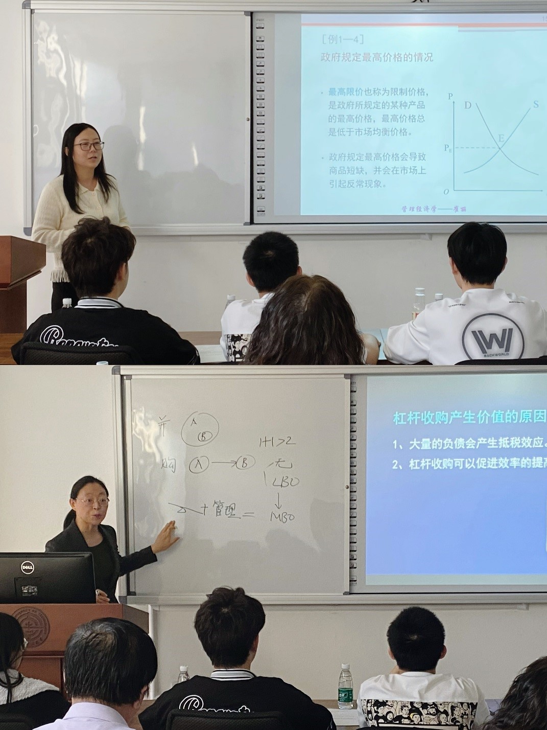 通过前期教学资料提交、课堂教学效果评价两个环节,崔丽老师、郎香香老师顺利进入最终的认证环节,两位老师就教学内容、教学方法、取得的成果和改进措施等进行汇报,并分别围绕《管理经济学》《财务管理》两门课程进行课堂教学展示。讲课过程中,两位老师贯彻教学相长理念,注重与听课学生的交流互动,提出知识、思维、能力、素质四点教学目标,并运用案例分析法生动讲解专业知识。