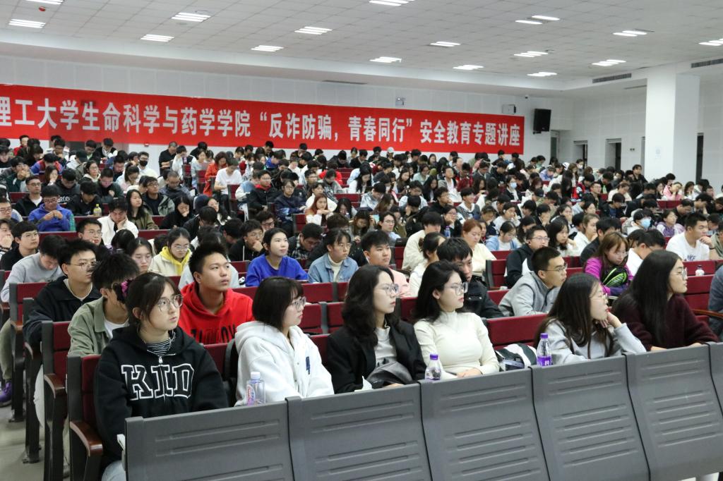 为有效防范电信网络诈骗违法犯罪,切实提高广大师生识别防范电信网络诈骗的意识和能力,10月19日,生命科学与药学学院在A01-W101教室顺利开展“反诈防骗 青春同行”安全教育专题讲座。本次活动邀请到盘锦市公安局电信网络诈骗案件侦查支队情报大队大队长刘哲辰担任主讲嘉宾。会议由生命科学与药学学院党委副书记、副院长岳宏博主持,400余名师生参加了本次讲座。
