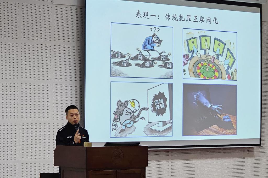会上,刘警官结合多年从警经验,紧密围绕着“什么是电信网络诈骗”“电信网络诈骗的常见形式、理解误区”等问题进行细致讲解;同时,结合真实案例,重点就贷款诈骗、刷单返利诈骗、冒充公检法诈骗、冒充熟人诈骗、买卖游戏装备诈骗等诈骗方式逐一向师生介绍。他提醒大家要时刻保持警惕,不轻信来历不明的电话、短信,不随意向陌生人泄露自己及家人的身份信息、银行账号、存款信息,做到不听不信、不转账不汇款,遇到可疑情况,要多方求证,及时与家人联系,并向公安机关反映,不给诈骗分子可乘之机。