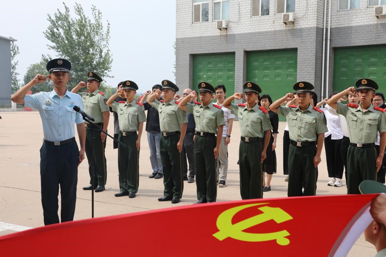 商学院党委书记郭永欣、盘锦市海警局党委书记郭献才,学院师生党员与盘锦市海警局全体官兵一同重温入党誓词,随后教师党员代表、官兵党员代表为新发展党员佩戴党员徽章,并赠发《中国共产党章程》。