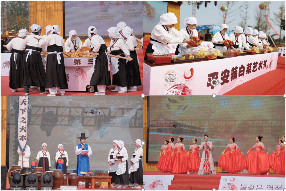 活动现场人流如织,浓郁的朝鲜族风情扑面而来,热闹非凡。本届活动共分为微素描展览、朝鲜美食、非遗文创、民俗体验、风情演绎5个板块,具体包含百人腌制辣白菜、千人拌饭、朝鲜族婚礼秀、歌舞秀、音乐晚会、投壶、射箭等20余项活动。本届辣白菜艺术节的规模盛大、形式新颖,不仅宣传了平安村朝鲜族文化,让更多的人了解平安村这个休闲乡村、和美乡村,更充分展现了新时代新农村在全面推进乡村振兴方面的成果。