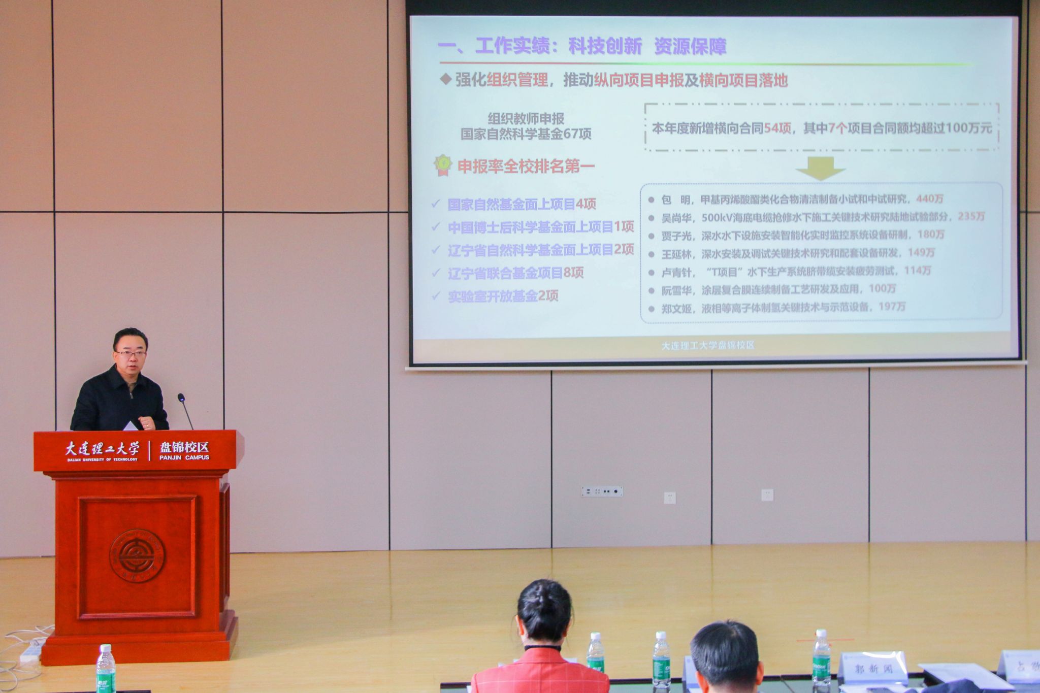 盘锦校区管委会副主任兼化工海洋与生命学院院长郭新闻代表学院领导班子作2024年述职报告。郭新闻从坚持党的建设引领、完善人才培养体系、提升科技创新能力、精准引才长效育才、深化国际交流合作等方面全面总结了学院事业发展情况。未来,学院将进一步凝练学科方向,持续加大平台建设力度,强化有组织的科研,全方位提升学院教学质量,着力打造一流本科教育与研究生教育体系,为学院高质量发展奠定更加坚实的基础。
