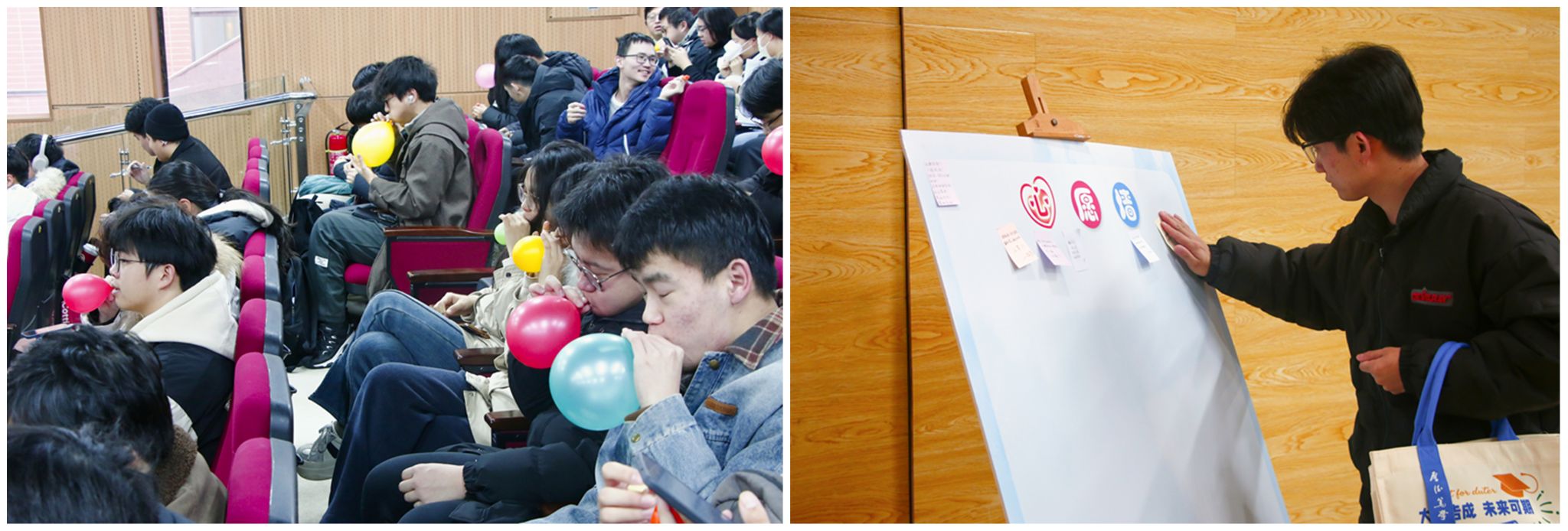 精心设计的暖场互动环节迅速点燃氛围。气球解压游戏让同学们在轻松互动中释放长期积累的备考压力;心愿墙上,大家挥笔写下“一战成硕”“不负韶华”等励志寄语,字里行间充满对梦想的执着与同窗间的鼓励,让整个报告厅瞬间升温。