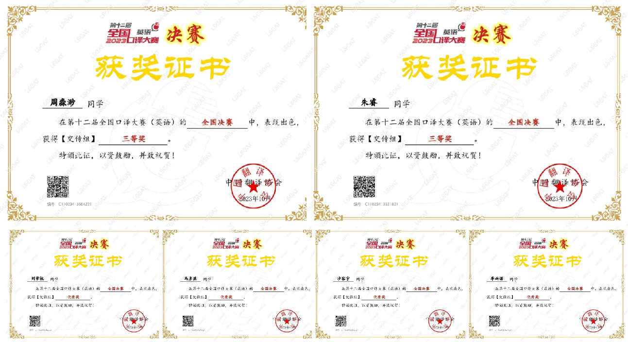 近日,由中国外文局指导、中国翻译协会和当代中国与世界研究院主办的第十二届全国口译大赛全国决赛落下帷幕,外国语学院盘锦分院商务英语专业学生在吴理德老师指导下,周淼渺、朱睿获得全国三等奖,刘紫杭、马彦淇、沙容宇、季雨诺获得优秀奖,这是自去年商务英语专业王雨纯同学以东北赛区一等奖(第5名)晋级全国总决赛之后,校区学子在全国口译大赛取得新的佳绩。