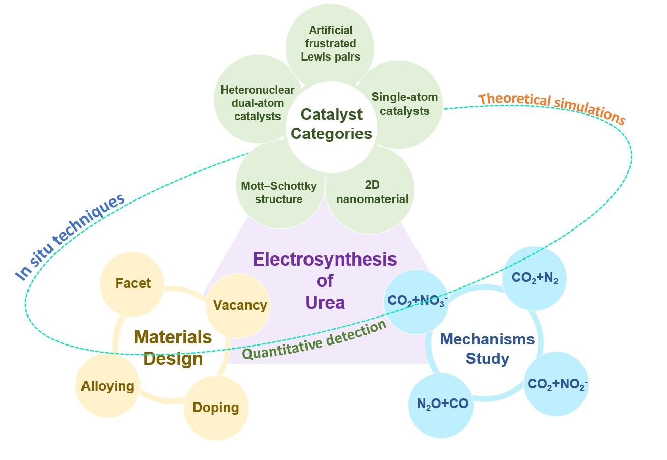 同月,曹江晖同学在Small期刊发表题为“Electrocatalytic Synthesis of Urea: An In-depth Investigation from Material Modification to Mechanism Analysis”的文章,由大连理工大学任雪峰副教授和刘安敏副教授共同指导并担任论文的共同通讯作者。该论文总结了不同氮源(NO3−、N2、NO2−和N2O)和碳源(CO2和CO)为原料的电化学合成尿素研究进展。深入探讨了材料设计的先进方法,如掺杂、晶面工程、合金化和空位引入等。同时,介绍了现有的尿素合成催化剂的类别,包括二维纳米材料、Mott-Schottky结构材料、人工受阻路易斯对材料、单原子催化剂和异核双原子催化剂等。并综合分析了现代尿素检测技术的优点、缺点和最新进展。