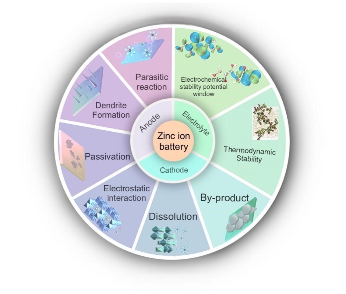 2024年6月,曹江晖在Chemical Engineering Journal期刊发表题为“Material Design and Mechanism Study for Zinc Ion Batteries: Applications of Density Functional Theory Calculations and Molecular Dynamic Simulations”的文章,该论文由大连理工大学任雪峰副教授、刘安敏副教授以及纽约州立大学布法罗分校武刚教授共同指导并担任论文的共同通讯作者。论文探究了DFT计算和MD模拟在锌离子电池中的应用,包括如何使用DFT计算和MD模拟来评估电池性能,分析离子迁移路径以及研究材料特性。并在分析当前研究基础上,提出了锌离子电池正极、负极、电解液和添加剂的未来发展方向,并进行了理论计算分析。特别介绍了负极材料改性,电解液筛选,添加剂的选择,欠点位沉积方法等,并介绍了不同类型正极材料(如锰基、钒基、有机正极和卤素正极等)。该论文提出了计算化学的优点和缺点,展示了其在ZIBs领域的应用,并强调了理论计算手段在材料科学方面的应用潜力。