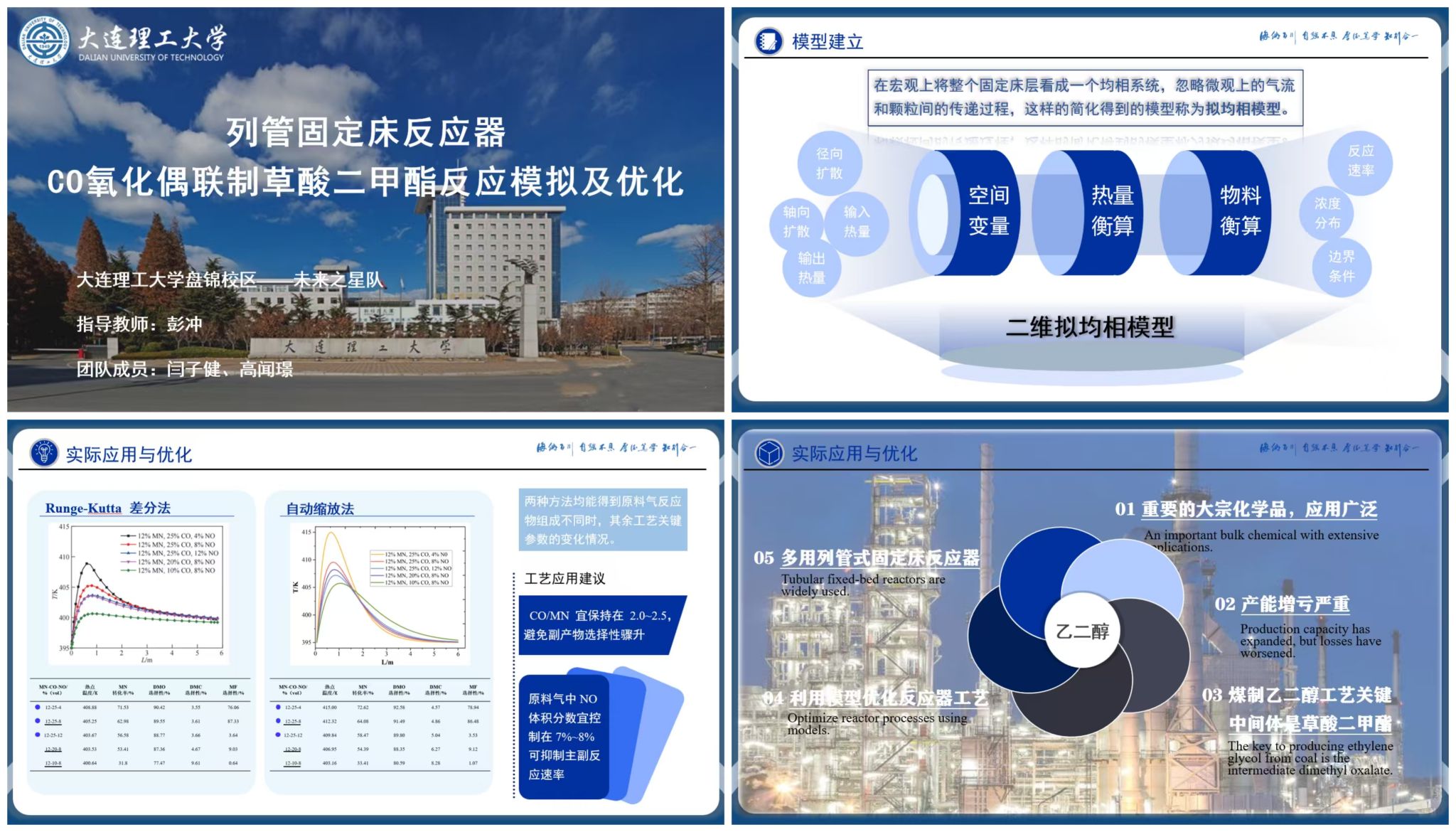 在以草酸二甲酯作为关键中间体的煤制乙二醇工艺中,其制备过程往往备受关注。在彭冲教授的悉心指导下,由闫子健、高闻璟两名学生组成的“未来之星”团队以工业中关键的煤制乙二醇工艺为背景,聚焦一氧化碳氧化偶联制草酸二甲酯这一反应过程,致力于通过建模与优化,提升反应效率与产物选择性,为工业列管式偶联反应器的改进和工艺优化提供参考。