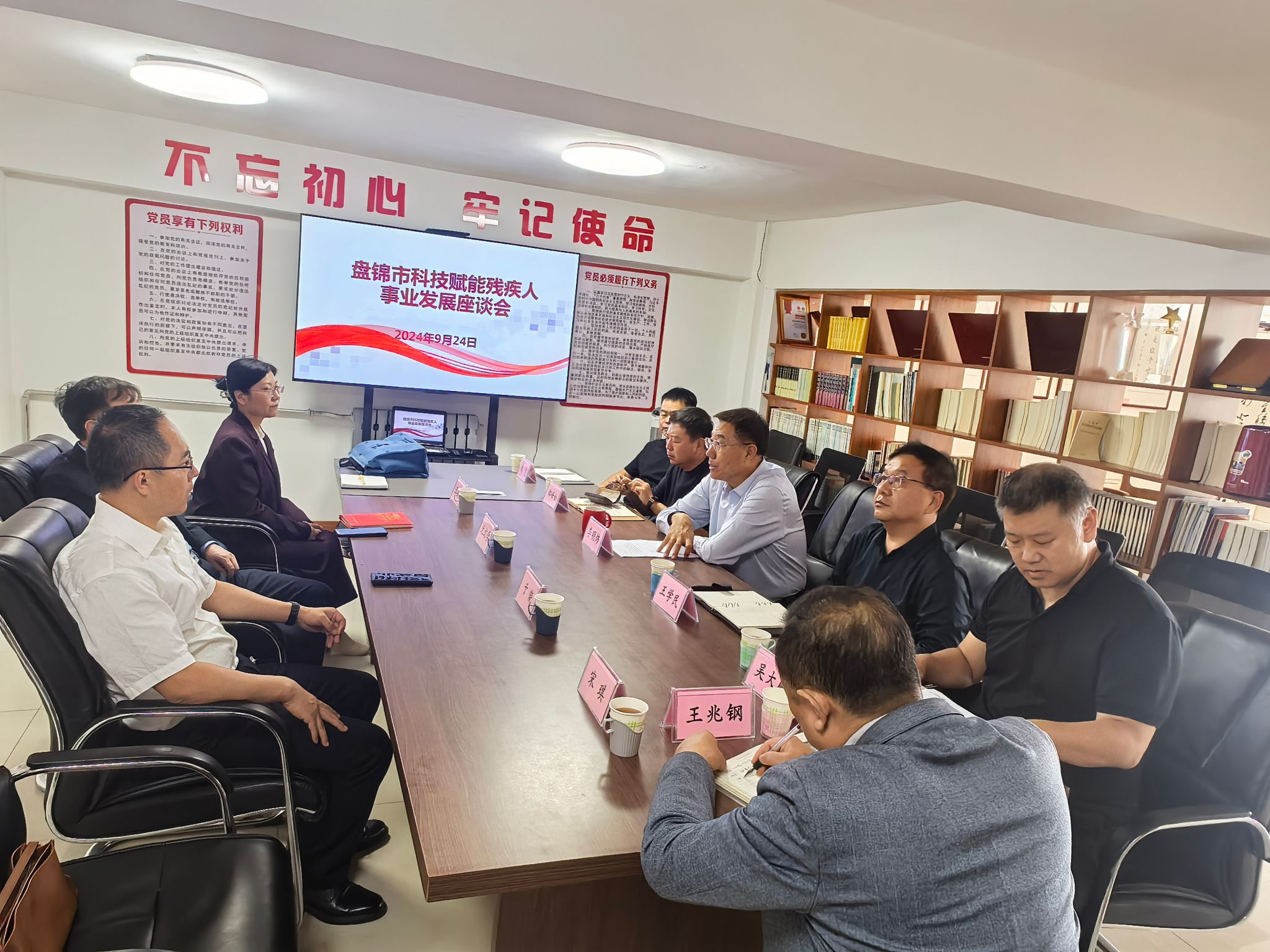 李明炜对元文学一行的到来表示欢迎,并从组织架构、工作职责、发展建设等方面介绍了盘锦市残疾人联合会的基本情况。公共基础学院王震男副教授介绍了学院教师关于残疾人事业发展方面的研究背景和进展。双方就贯彻落实《辽宁省残联科技助残赋能残疾人事业高质量发展专项行动实施方案》文件精神,重点结合盘锦市科技助残工作实际和学院开展合作、搭建平台、开展科技助残项目研发等工作进行交流研讨,并就具体领域达成初步合作意向。