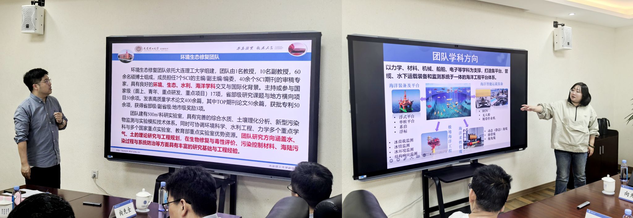 化工海洋与生命学院周豪副教授和曾岑副教授分别代表环境生态修复团队和海洋技术装备团队介绍研究成果。