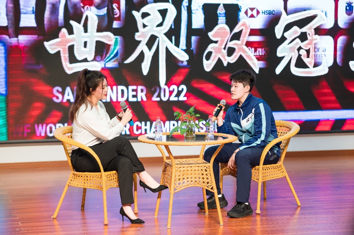时值午休,现场观众仍热情高涨,翘首期待这场以“在汗水和拼搏中展现青年担当”为主题的访谈互动活动。访谈中,刘圣书与现场师生分享了自己的训练经历、心路历程以及精神成长等故事,在疫情期间进行封闭训练的艰辛虽然最长的训练时间一天会有八小时,但她始终秉持着永不言弃和坚持不懈的信念,不断提高自身能力和水平。谈到身披国家队战袍站在世界舞台上奋力拼搏时的感受,她坚定的表示,身披带着国旗的衣服就代表了国家,即是为国而战,在场上的表现就代表着国家,内心油然而生的是一种自豪感,想要为国争光。