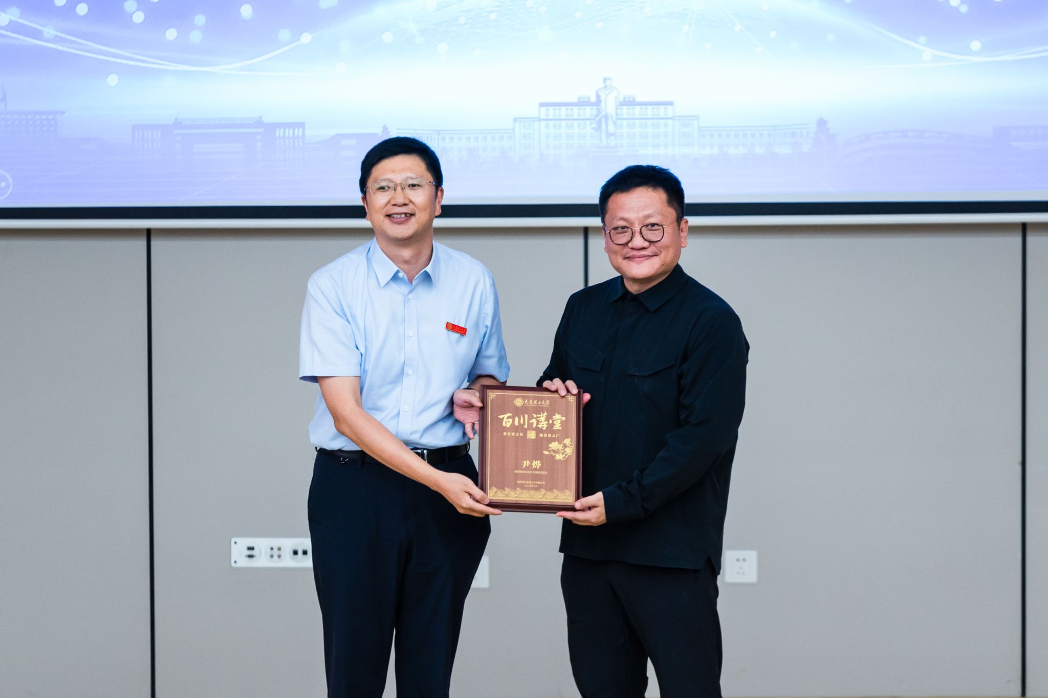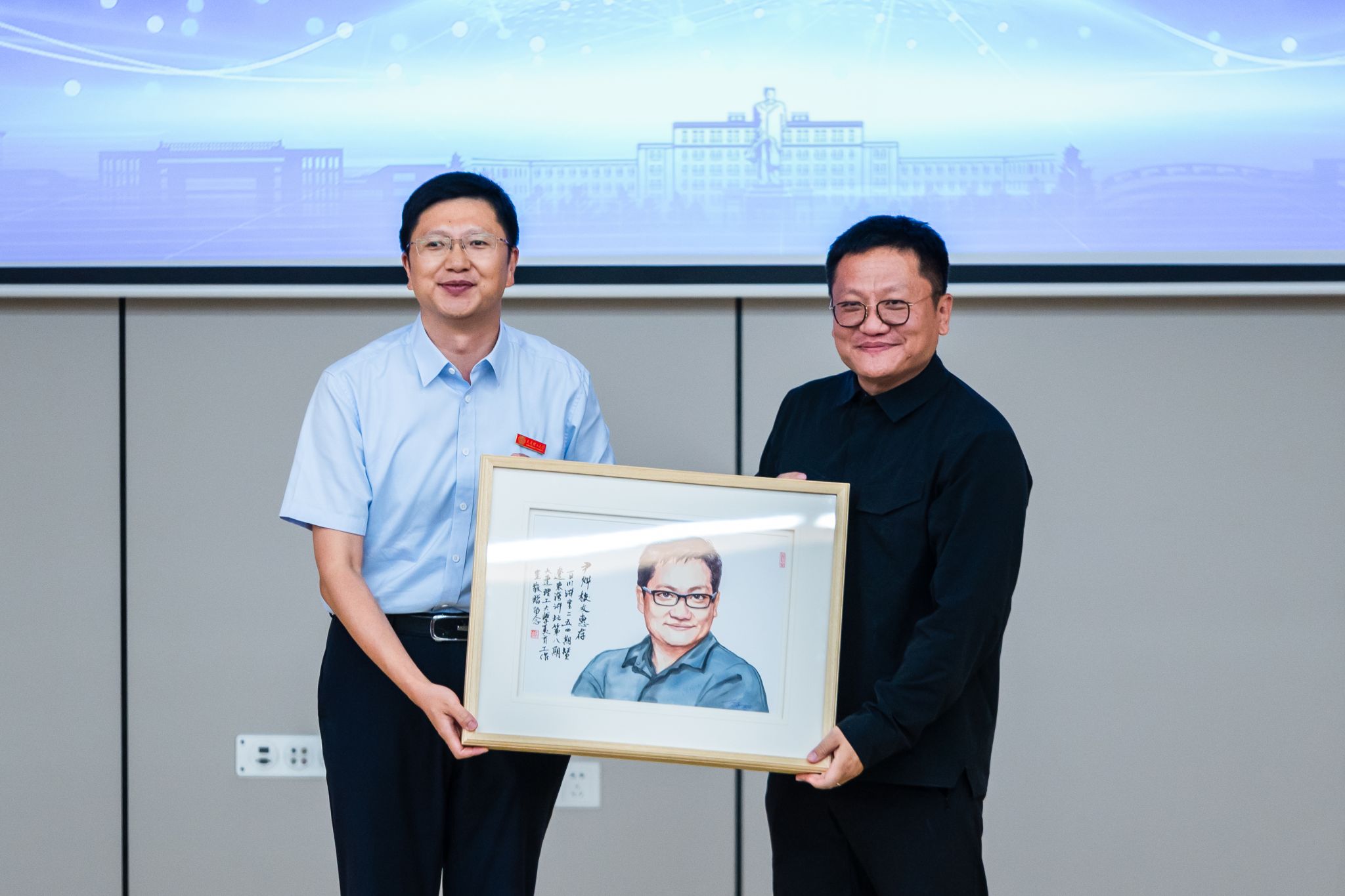 最后,占敬敬代表学校为尹烨校友颁发“百川讲堂”纪念牌,并送上我校学生精心绘制的肖像画。