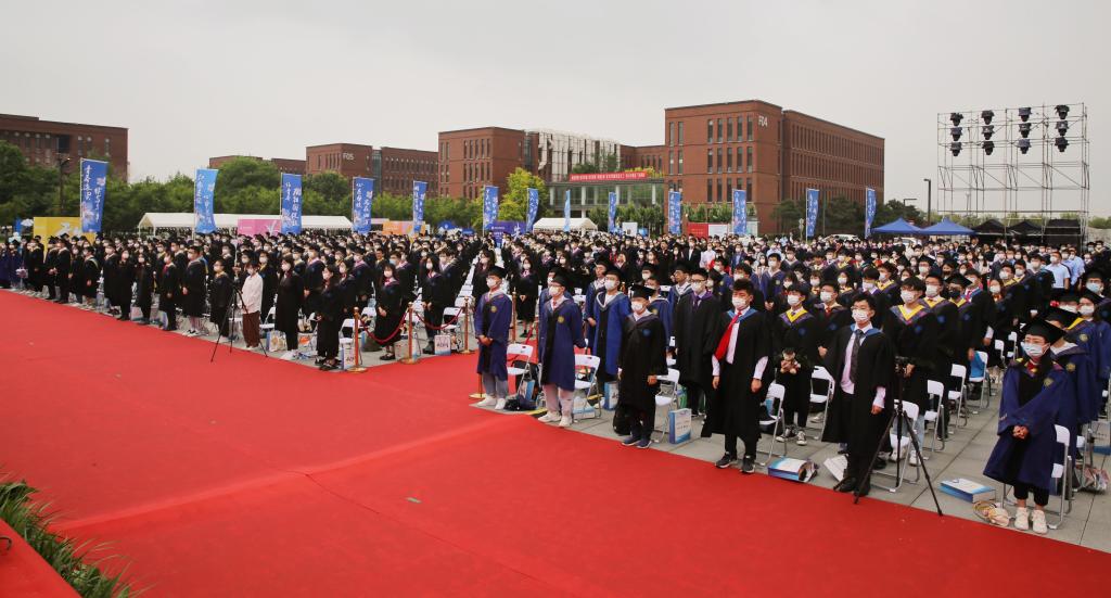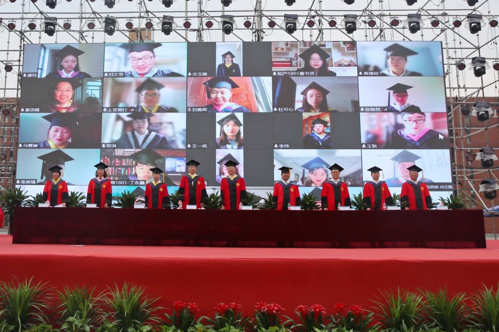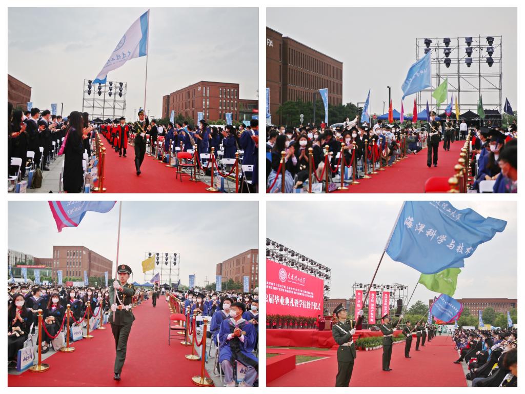 在雄壮的国歌声中,毕业典礼正式开始。根据疫情防控要求,部分毕业生未能返回校园参加毕业典礼,当天特别设置了云授予学位环节,校长助理兼盘锦校区党工委书记、管委会主任、莱斯特国际学院直属党支部书记、院长占敬敬教授,生命科学与药学学院院长张嘉宁教授,海洋科学与技术学院院长张大勇教授,体育与健康学院盘锦分院副院长元文学教授,化工学院盘锦分院副院长包明教授,商学院、知识产权学院副院长洪勇教授,外国语学院盘锦分院副院长于风军教授,基础物理教研室主任詹卫伸教授为线上参加毕业典礼的毕业生进行了云端拨穗。
