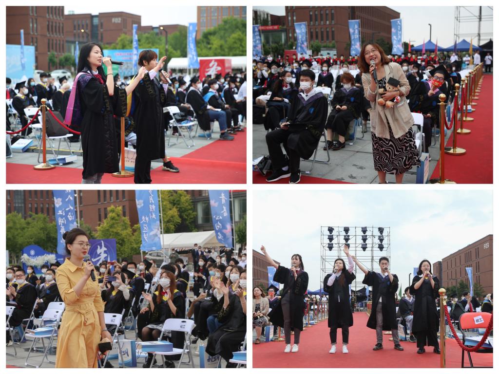 典礼开始前,辅导员代表、毕业生代表以快闪的形式从观众席走到场地中间,演唱了《后会无期》《有没有那么一首歌》《起风了》《不说再见》等歌曲,点燃全场热情。随后,大连理工大学校旗、各学院(分院)院旗和导师团在全场热烈的掌声中出场。