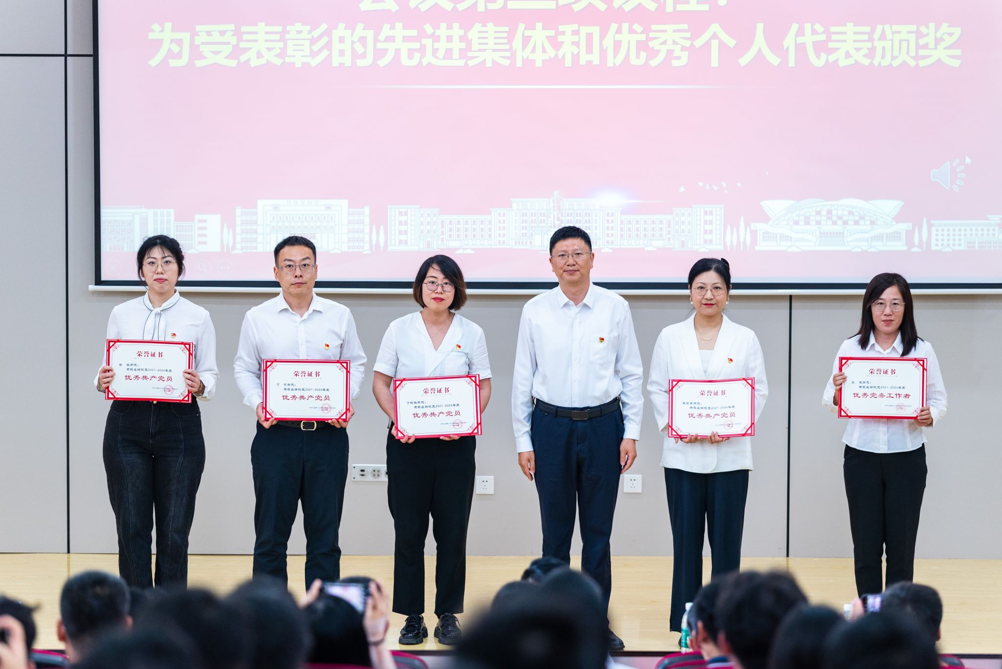 占敬敬宣读《中共大连理工大学盘锦校区工作委员会关于表彰2021-2024年度优秀共产党员、优秀党务工作者、先进基层党组织的决定》。罗钟铉、占敬敬分别为先进集体和优秀个人代表颁发荣誉证书。