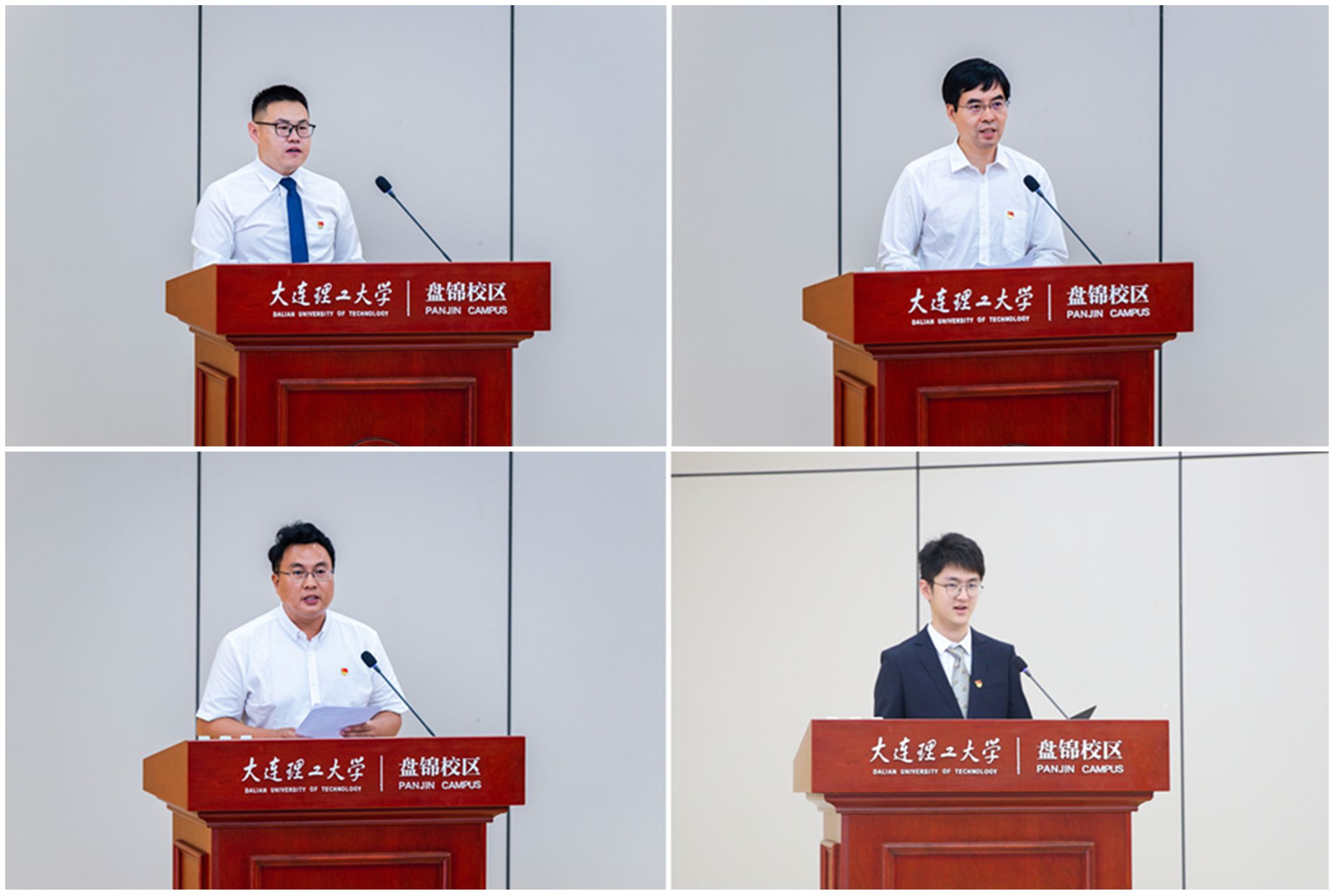 会上,优秀教师党员代表化工海洋与生命学院王振宇、优秀党务工作者代表商学院王常有、先进基层党组织代表公共基础学院数理与计算机教工党支部邹广宇、新发展预备党员代表莱斯特国际学院2022级本科生宋鼎耀先后作交流发言。