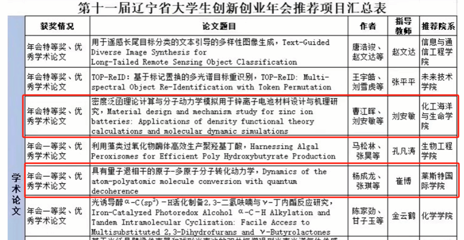 学院2021级本科生杨成龙负责,张琪、王犇、周宇浩参与的国家级大学生创新项目《冷原子系统耗散动力学研究》荣获辽宁省大创年会一等奖,此项目由杨成龙完成并参与最终参赛答辩,由公共基础学院崔博副教授进行指导。此外,杨成龙作为第一作者在JCR分区Q2期刊Physica Scripta上发表的SCI论文《Dynamics of the atom-polyatomic molecule conversion with quantum decoherence》获评优秀学术论文。