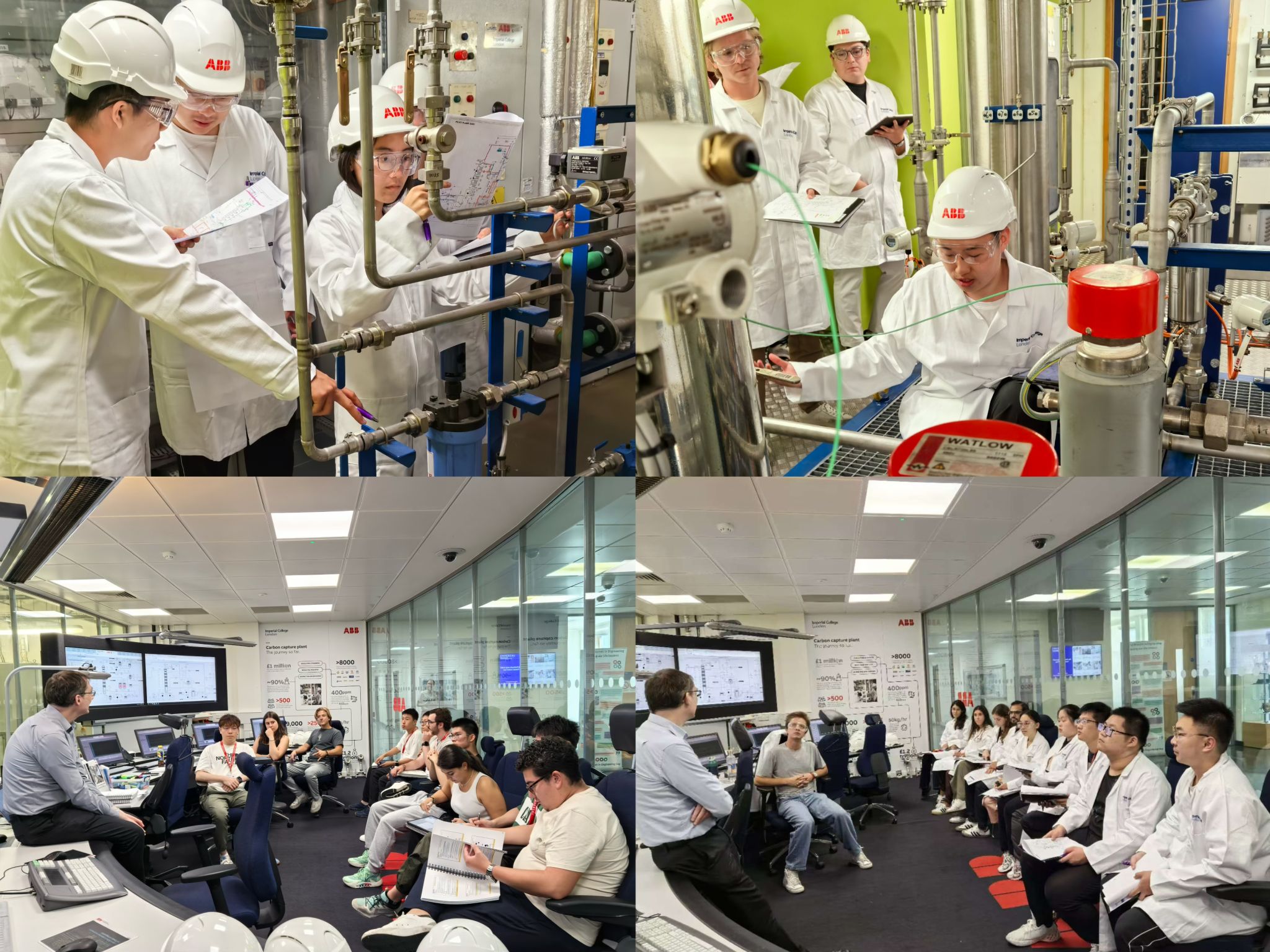 在工厂实习阶段,Colin教授深入讲解了工厂中二氧化碳捕捉的原理,并说明了如何阅读和解析P&ID。同学们手持P&ID图纸,进入工厂对不同楼层的管路和仪表进行熟悉及核对,并向其他同学讲解所负责楼层的流程、图纸与实地安装的差异所在。Colin教授还介绍了化工生产中常见的各种仪表,利用模型讲解各类仪表的内部构造及工作原理,并带领大家进入工厂查看P&ID中的仪表在实际生产中的工作环境和信号输出方式。