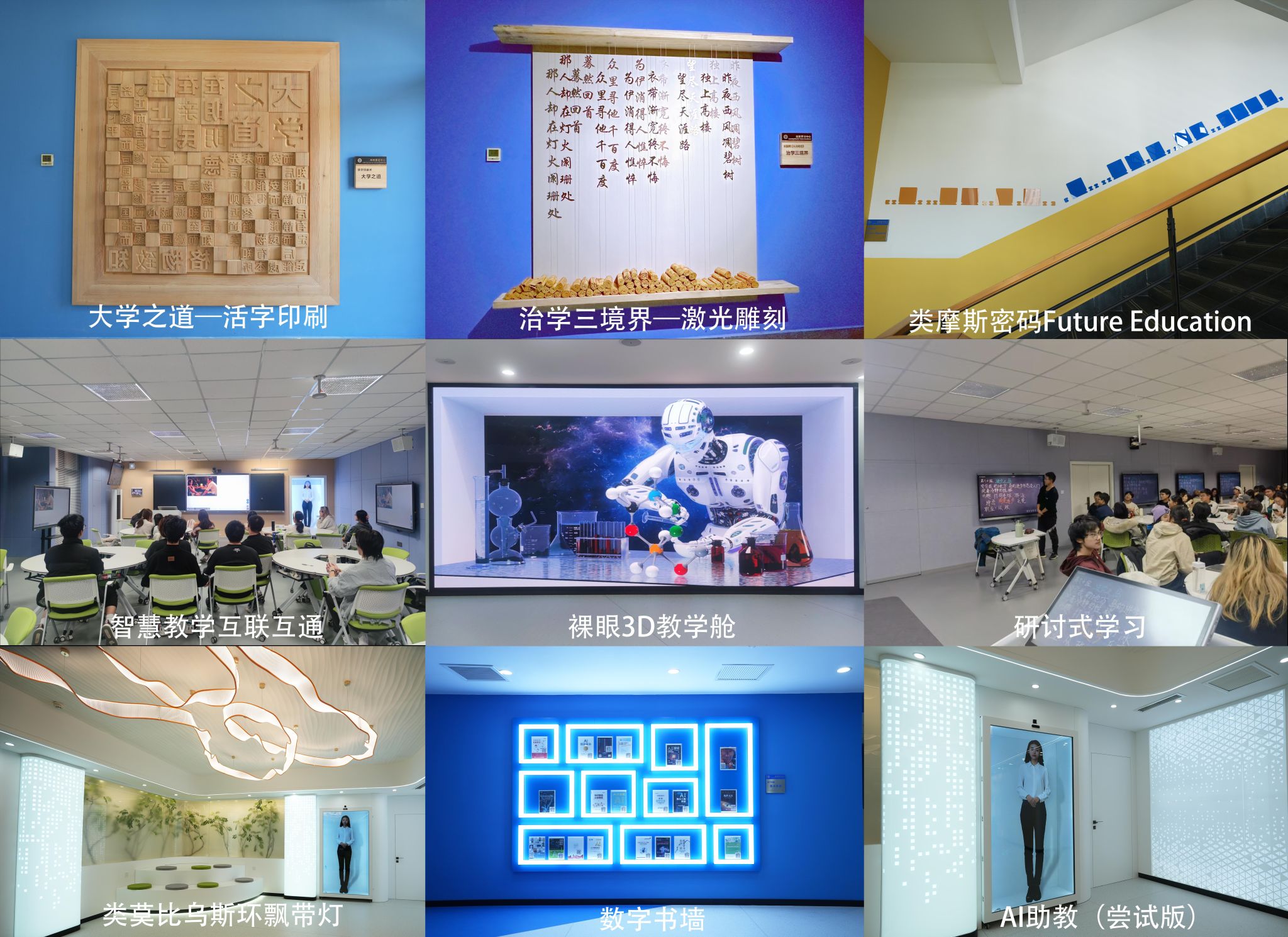 在这里,以四书之首《大学》开篇“大学之道,在明明德,在亲民,在止于至善……”作为起点,融入丰富多彩的中华优秀传统文化育人元素,强化学生文化自信;配置德智体美劳通识类和人工智能专项类等优质数字图书资源和先进的教学设施,实行可视化、研讨式、项目式教学。规划AI孪生教师,可以模拟真实教师,与智慧教学研讨室同步沉浸式上课,还可以实现AI自主授课;同时,规划AI助教,对接通用大模型,打造教学专属小模型,为学生提供答疑辅导、英语口语练习、学情画像精准分析等。