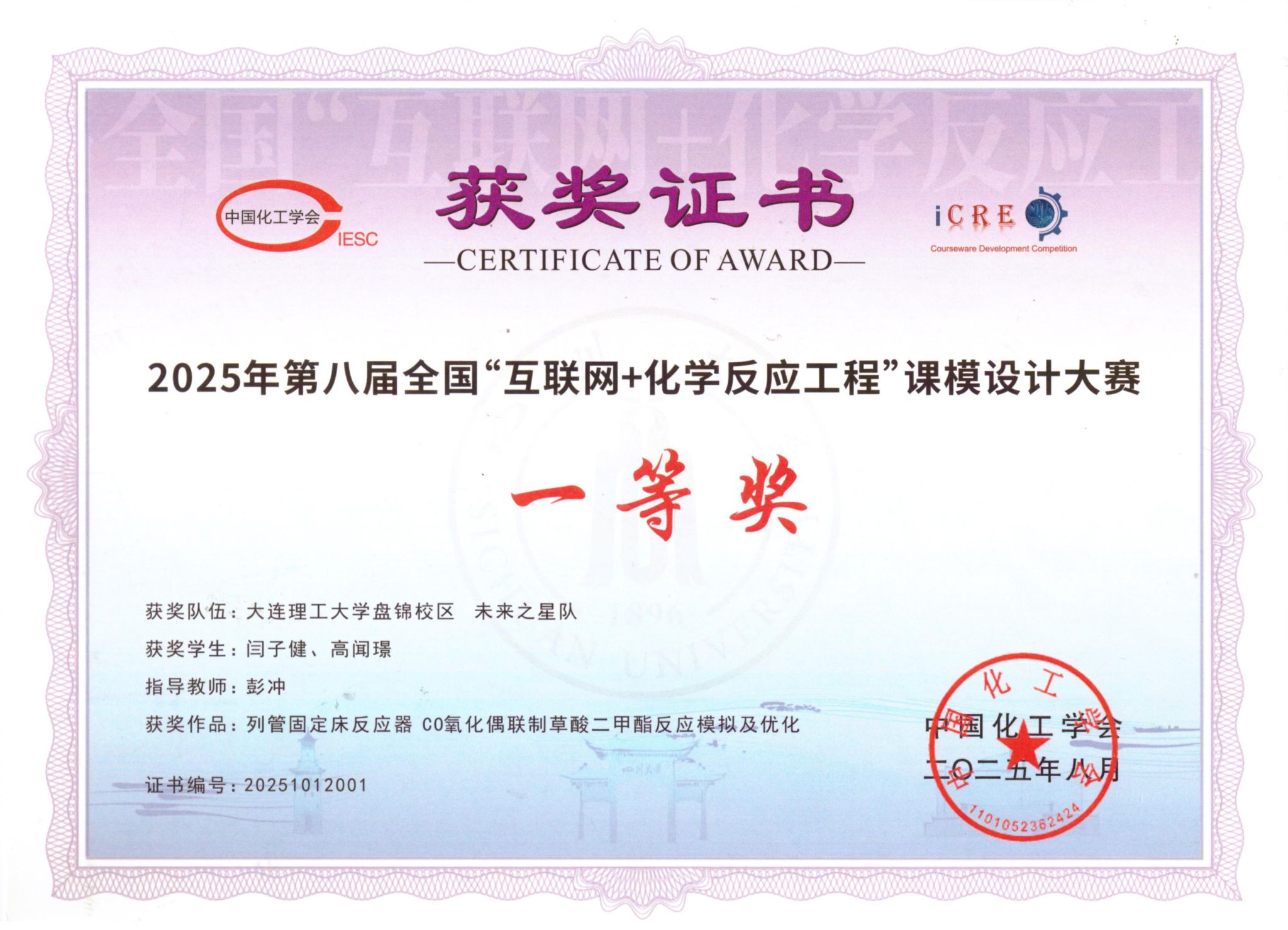 近日,由中国化工学会主办的第八届全国“互联网+化学反应工程”课模设计大赛在成都落下帷幕。大赛旨在提升学生对化学反应工程课程的兴趣与参与度,锻造学生的工程思维与分析能力。化工海洋与生命学院“未来之星”团队,在指导教师彭冲教授指导下斩获全国一等奖。这也是化工海洋与生命学院参赛团队在彭冲教授的指导下连续两年在该项赛事中荣获全国一等奖。