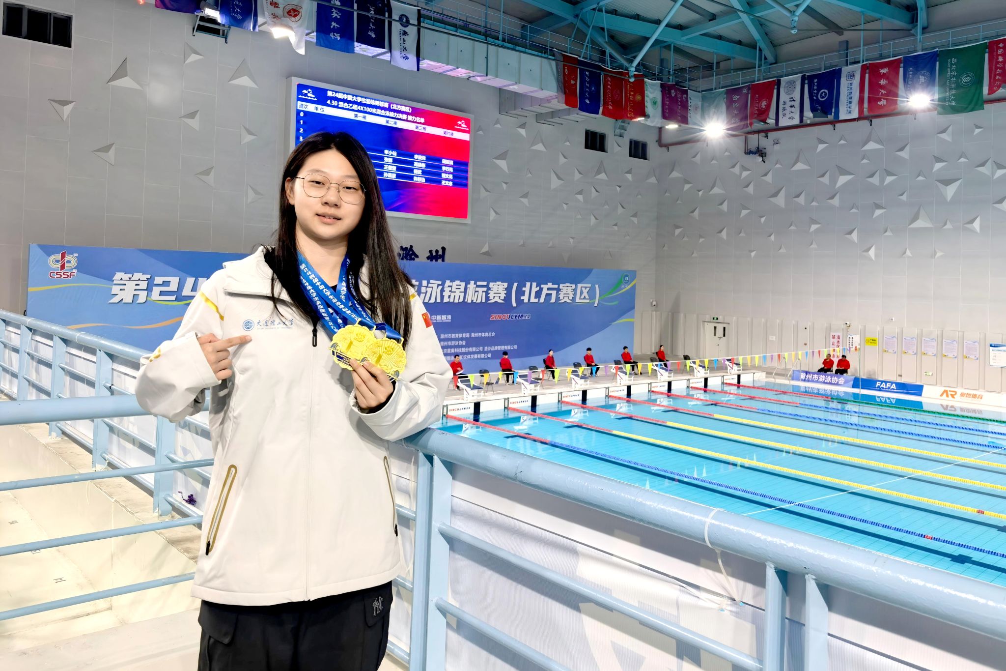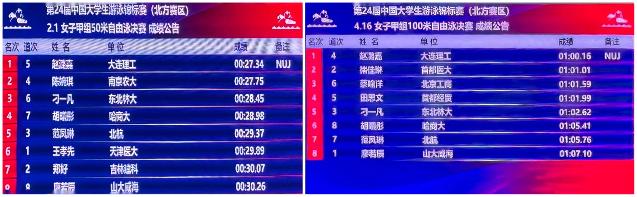 12月10日,第24届中国大学生游泳锦标赛(北方赛区)在安徽滁州奥体中心游泳馆圆满落幕。化工海洋与生命学院2025级学生赵潞嘉在比赛中发挥出色,连续取得优异成绩。她以27秒34夺得女子甲组50米自由泳冠军,并创造新的赛事全国纪录;随后,在100米自由泳项目中,游出1分00秒16的好成绩,再次夺得第一名并打破赛事全国纪录,展现了突出的竞技实力。