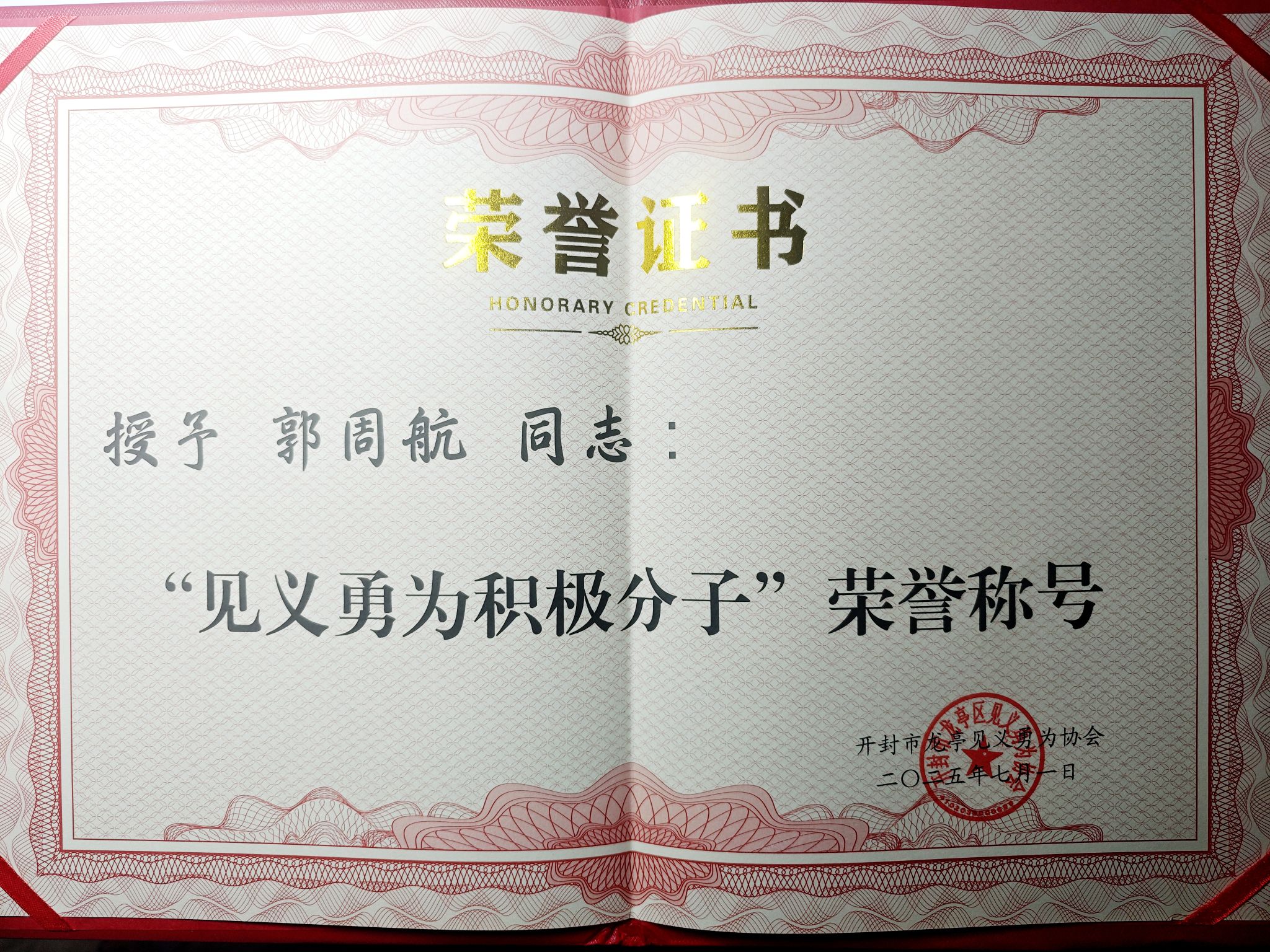 与此同时,开封市见义勇为协会也为郭周航颁发了“见义勇为积极分子”荣誉证书。据郭周航介绍,民警告诉他,在该区域的黄河救援中,成功救人的情况并不多,此次能救下父子二人,是多方协作的结果——“当时军人的同伴、周围群众都在帮忙,有的打电话联系相关部门,有的找糖果、温水,大家都在尽一份力。”
