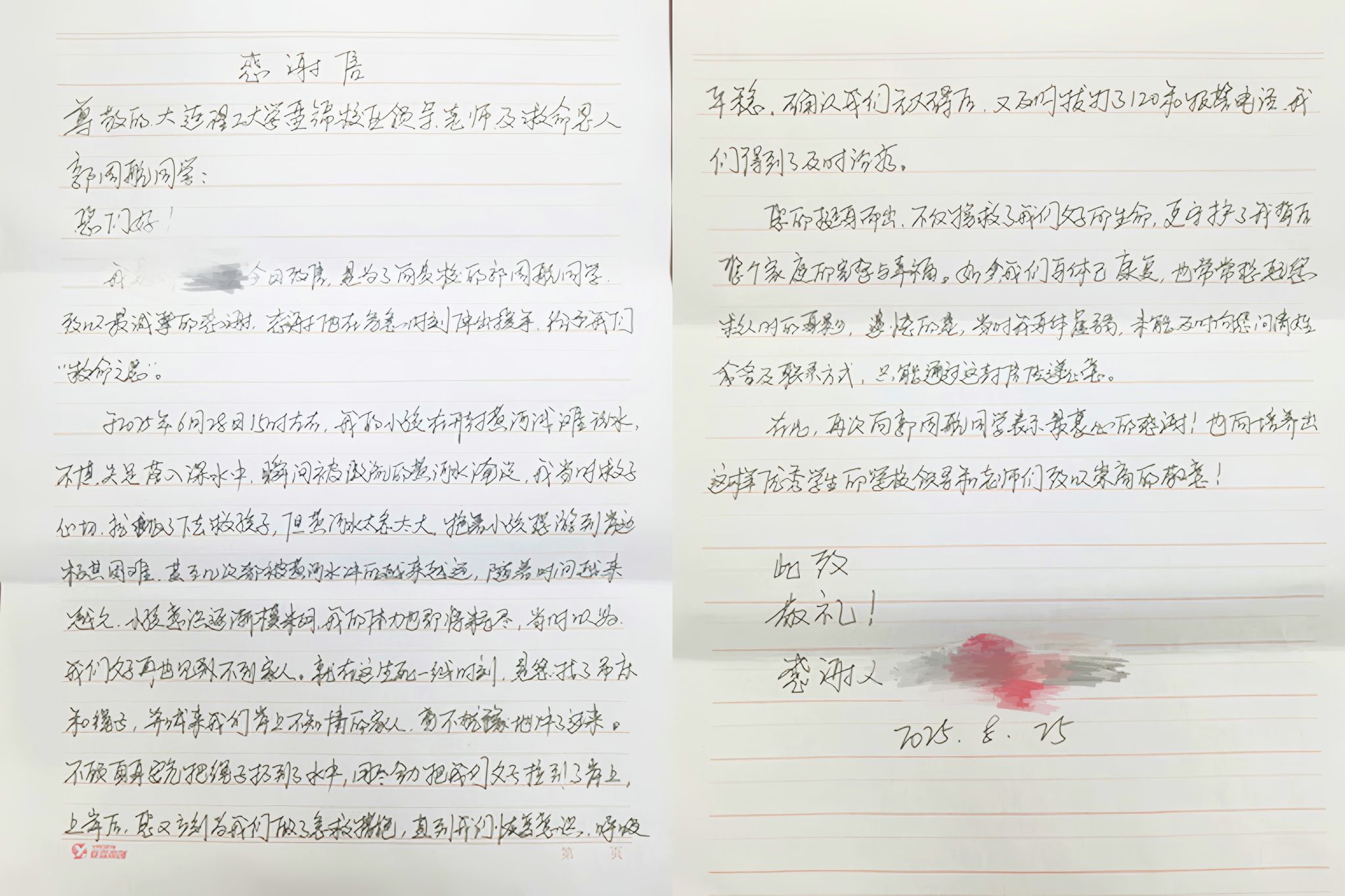 如今,落水父子已康复出院。为表达感激之情,家属通过民警联系到郭周航,还特意写下感谢信寄往大连理工大学,信中写道:“您的挺身而出,不仅挽救了我们父子的生命,更守护了我背后整个家庭的完整与幸福。”
